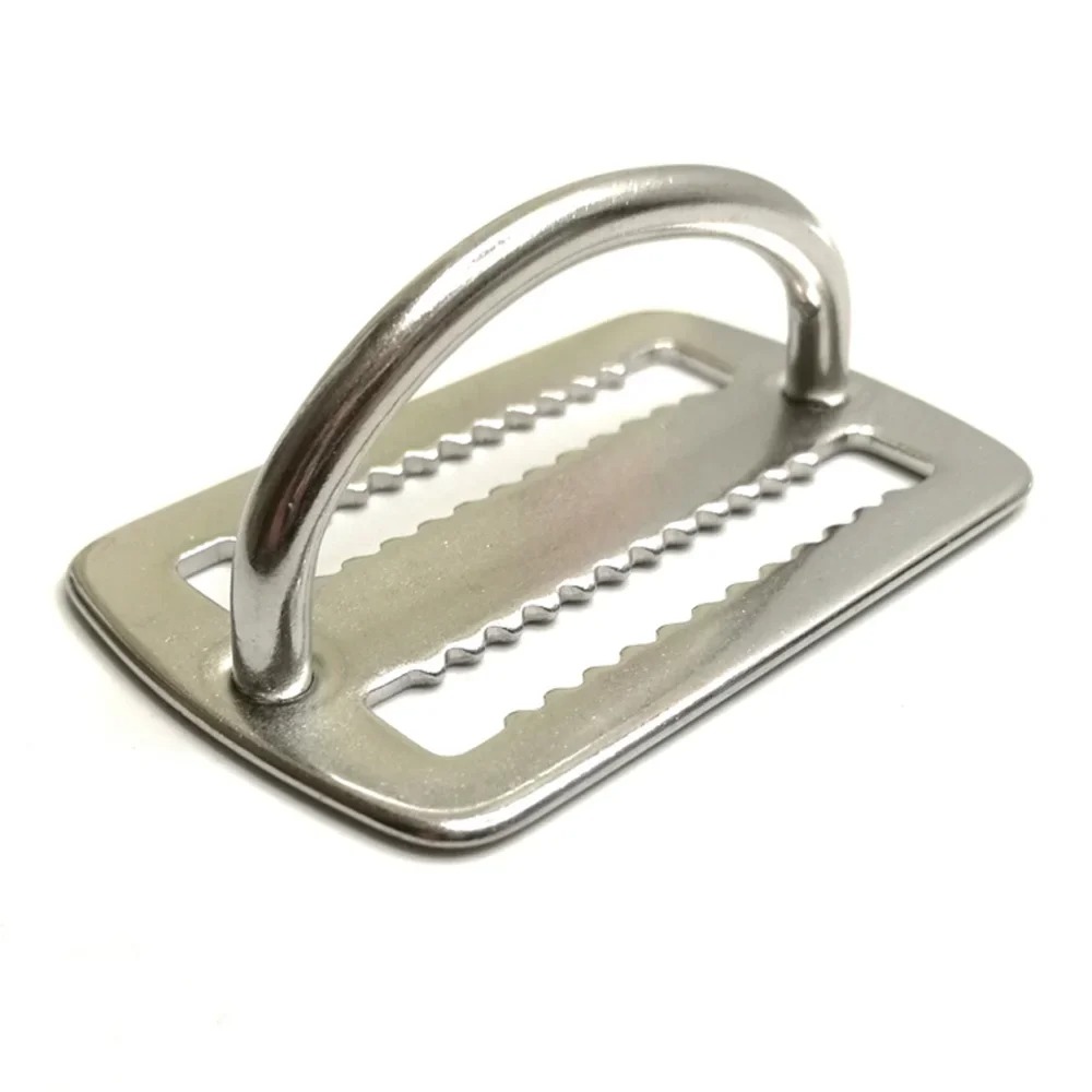 Pieza integral de retenedor con anilla D soldad a 90 grados, en acero inoxidable. El conjunto rígido, facilita la colocación y enganche de mosquetones con accesorios en arneses o cinturones.Esta pieza con esa angulación de 90 grados, está muy indicada para la zona de las caderas en los arneses de buceo ténico.